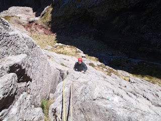 Today Ben and I undertook the slog up to South Wall on Garbh Bheinn. This crag is South facing so we were in the sun all day however winds were high and it made situations a little scarier. We started off on Butterknife VS, I led the first two pitches which were awesome, the best two pitches of the climb, then Ben did the second two, the last being the direct finish which gets 4c. We then went and climbed the amazing Excaliber HVS 5a. I did the 1st and third pitch and Ben just managed to get across the second. With high winds I wasn't really tempted by the harder routes and also Ben was having an 'off day' (yesterday his climbing partner took a huge ('whipper') so we fell asleep under the crag in the sun for a while before bailing. A steep walk in but worth it!