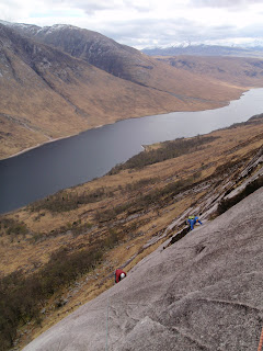 Today Blair and I headed up into Glen Nevis dodging the rain showers and puddles. We arrived at Steall Hut Crag to find Greg and Mike getting a work out on an 8a there. With quite alot of seepage around Blair and I had a go on the only route that looked dry (and the only route I had a chance of getting to the top of). We had a few goes on Trick of the Tail (7b+) which, quite frankly is nails, especially for my weak arms. I managed to get up to the top and workout most of the moves but felt I was a long way off leading it. Its proper run out at the start after the first bolt...no need for that! Fortunately Blair found it hard and scary too so I knew it just wasn't me.