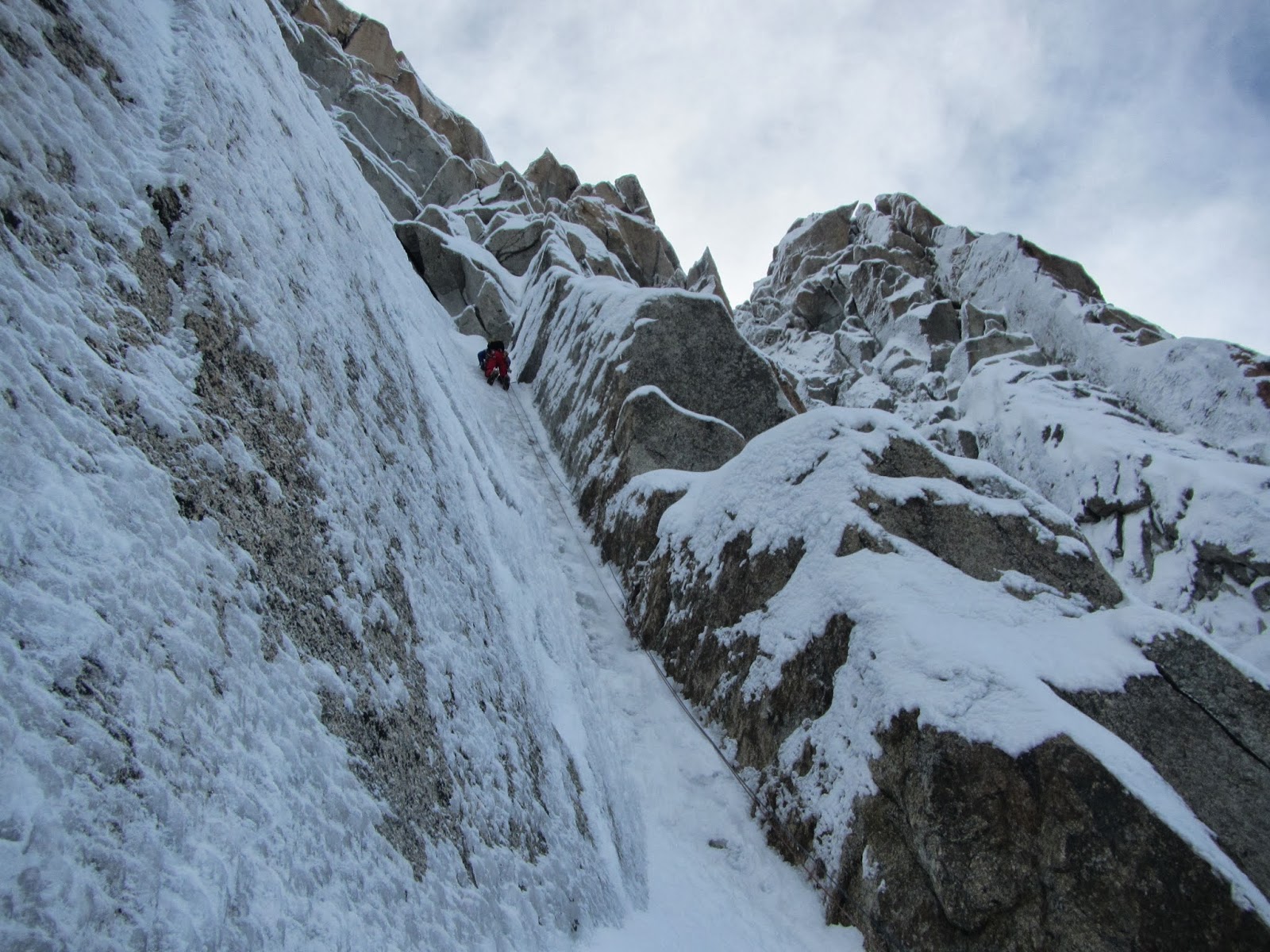 We couldn't decide who's idea it was to come to the Alps at this time of the year, I had once had a trip in October and it was fantastic conditions and we did some pretty cool routes. Now this trip was a little different. On the drive out we were psyched, we had Philippe Batoux's finest routes guidebook and were inspired and ready to get some 'Batoux' points. On arrival to Chamonix there was talk of snow, not only in the coming weeks but it had already fallen. With hundreds of objectives running through our heads we settled on the brilliant Vent du Dragon on Aiguille du Midi. Easy approach (4/5 abseils) and only 4 pitches....